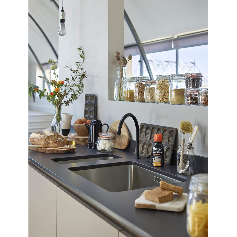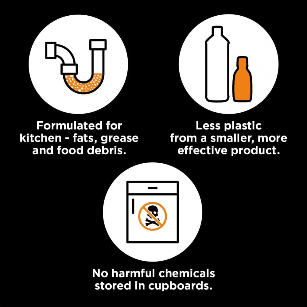 Product benefits: Unclogs kitchen drains and sinks, blasts fat and food debris
